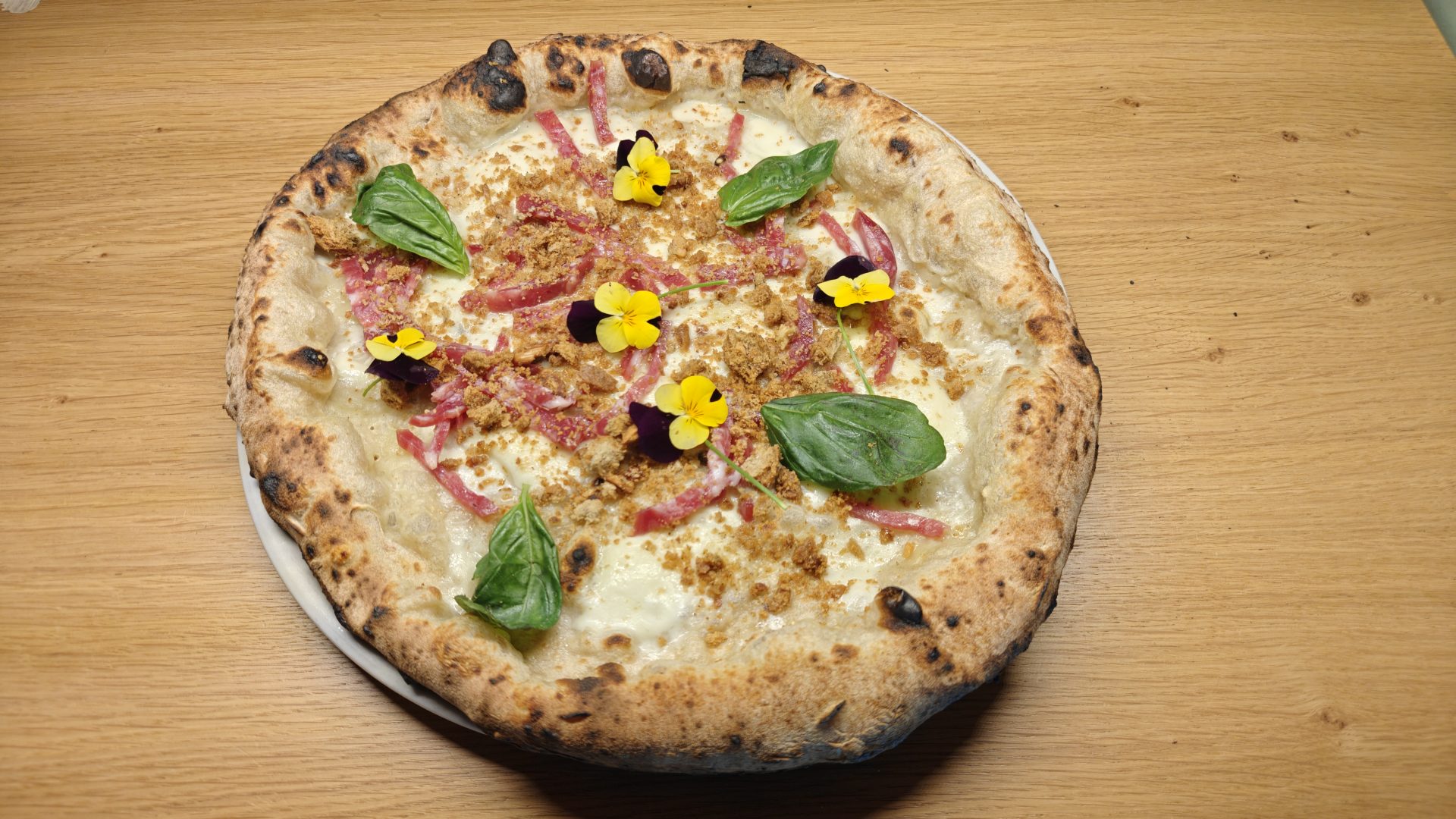 Fior di latte, prosciutto cotto arrosto, salame Napoli, funghi champignon, carciofi arrostiti, terriccio di olive taggiasche, gocce di confettura di San Marzano DOP