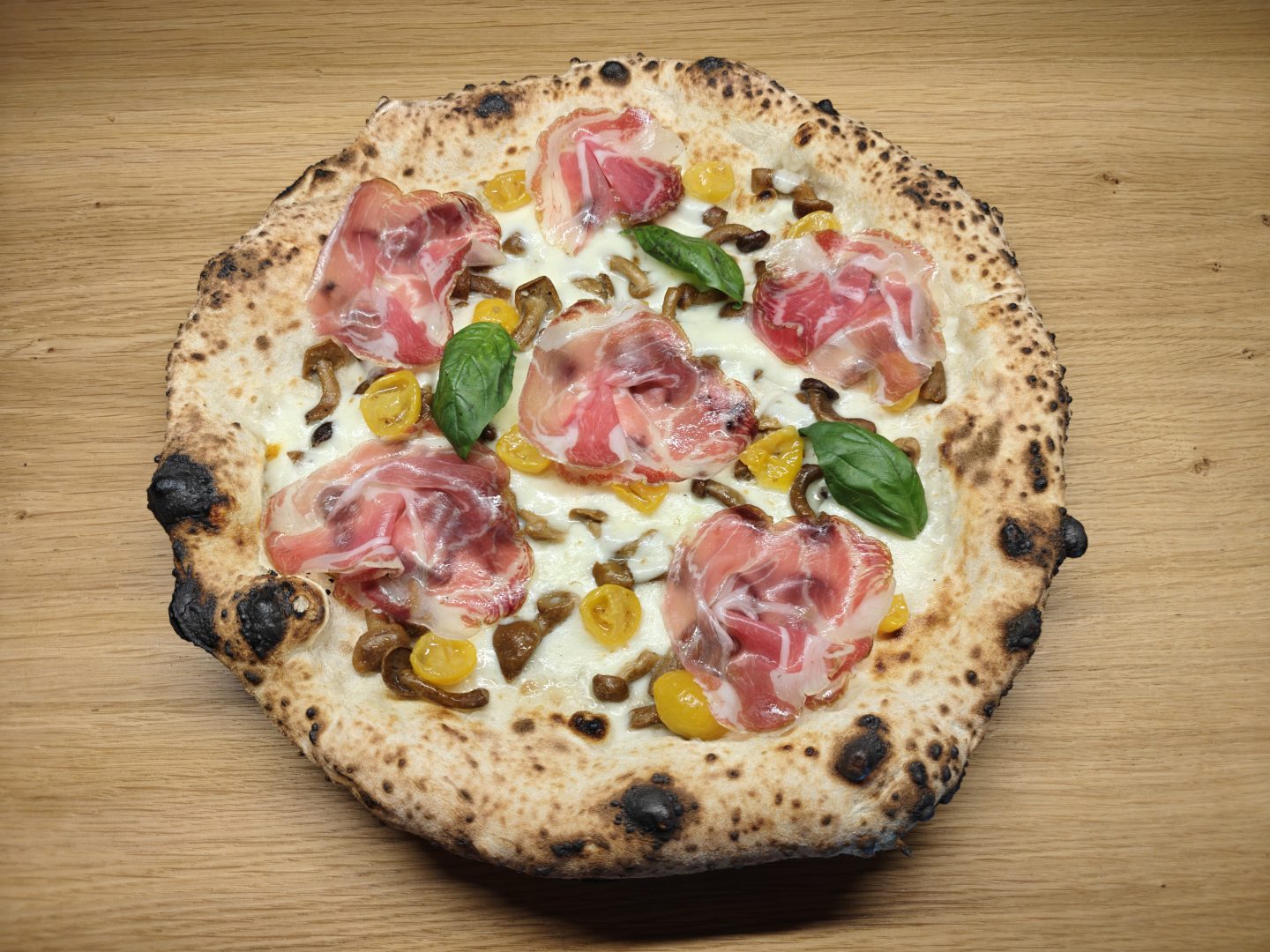 Fior di latte, roasted ham, Napoli salami, champignon mushrooms, roasted artichokes, Taggiasca olives soil, drops of San Marzano DOP jam